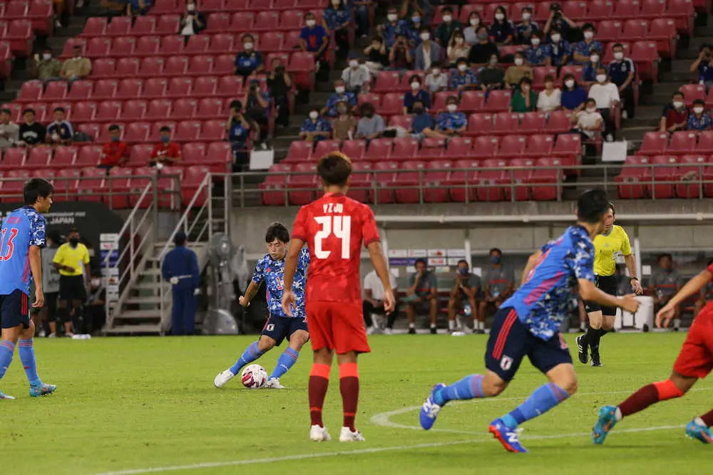 東京五輪では左MFの位置で3試合に先発。三笘らを上回る出番を得たが、A代表への昇格は果たせなかった。ブラジルなどと対戦した6月の4試合はテレビで観戦した。「昨夏に一緒に戦った仲間が活躍する姿を見て、心に響いた」。奮起しないわけがなかった。前半22分には縦パスで西村の得点を演出し、後半10分にはゴールに背を向け、クロスを右足のかかとで押し込む技あり弾。一度はつかんだ森保監督のハートを再び揺り動かすには十分なアピールとなった。