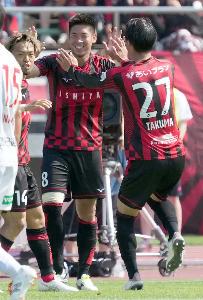 《札幌・名古屋>前半、先制ゴールを決めた深井(中央)はチームメートと喜ぶ(撮影・高橋茂夫)
