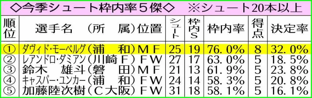 左利きのモーベルグは浦和で4―2―3―1の右サイドハーフを務め、内側にカットインしてのシュートを得意とする。来日が遅れ開幕に間に合わなかったものの、3月のホーム磐田戦で後半から初出場し、投入後わずか3分でデビュー弾を決めた。同じ磐田に今回も2点を積み上げ、今季出場16試合8得点。ランキング5位タイにまで上昇した。