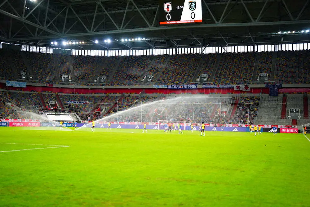 ドイツ遠征中の男子サッカー日本代表は27日、デュッセルドルフでエクアドル代表と対戦。前半13分にピッチのスプリンクラーが繰り返し誤作動を起こし、プレーが一時中断となるハプニングがあった。