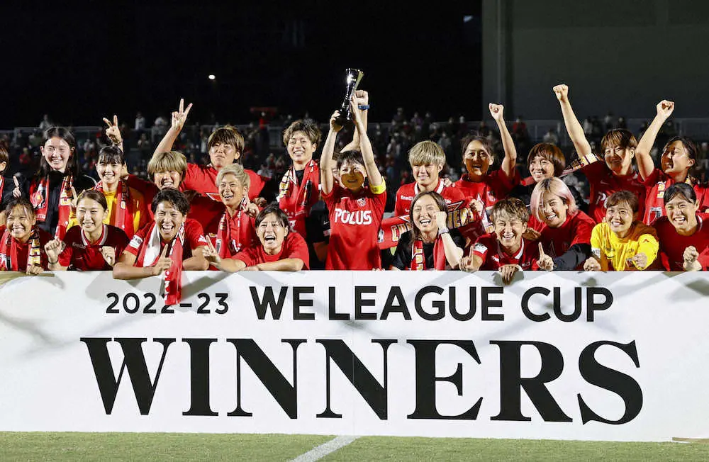 初代女王に輝き、大喜びする三菱重工浦和イレブン(共同)