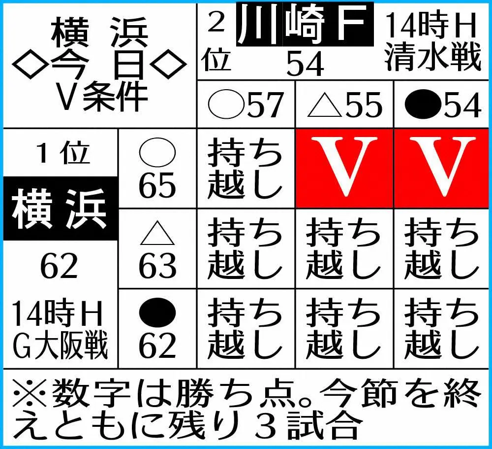 明治安田生命J1リーグ首位の横浜は8日午後2時、ホームの日産スタジアムでG大阪戦を迎える。勝ち点62の横浜が勝ち、同54の2位川崎Fがホームで同時刻キックオフの清水戦に引き分け以下なら、3試合を残して横浜の3年ぶり5度目のリーグ優勝が決まる。それ以外の結果なら、12日磐田戦以降に持ち越される。