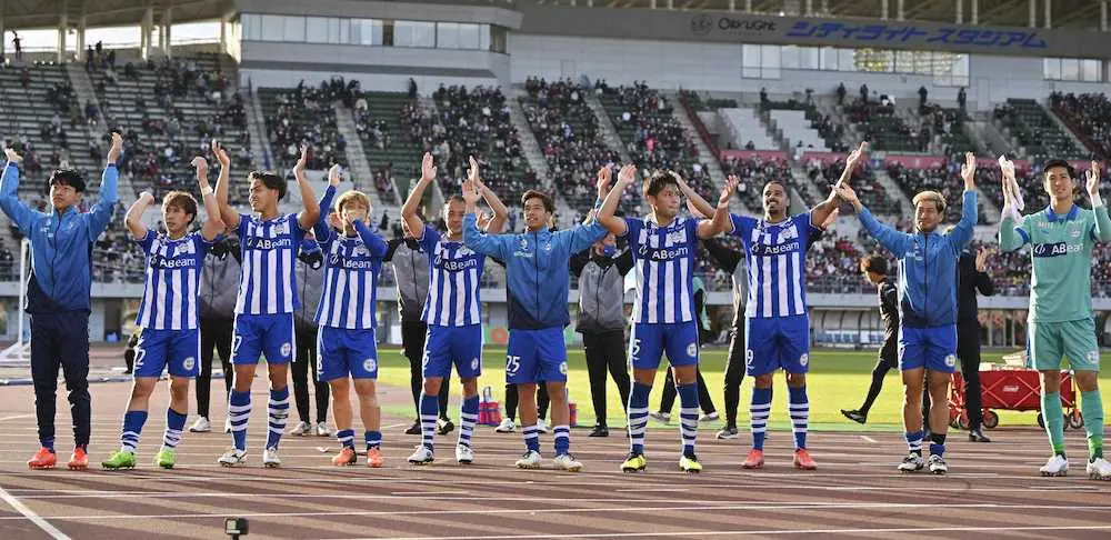 <岡山・山形>勝利し、サポーターとともに喜ぶ山形イレブン