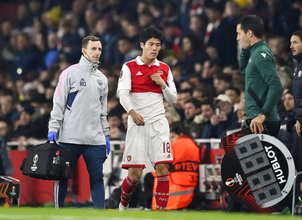 <アーセナル・チューリヒ>負傷交代するアーセナルの冨安(中央)(ゲッティ=共同)