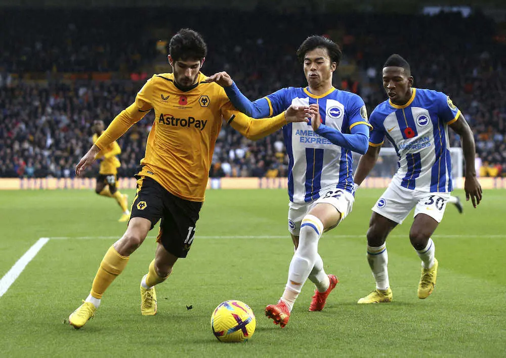 サッカーのイングランド・プレミアリーグでブライトンに所属する日本代表MF三笘薫(25)が5日、アウェーのウルバーハンプトン戦で初ゴールを決めた。中盤の左サイドで先発すると、1―2の前半44分に右クロスに競り合ってヘディングで同点弾。直後のアディショナルタイムにはロングボールに抜け出し、ファウルで止めた相手の退場を誘発した。前半10分にも左サイドから狭いスペースに右アウトサイドで絶妙なパスを通して先制の起点となり、前半から存分に存在感を見せつけた。