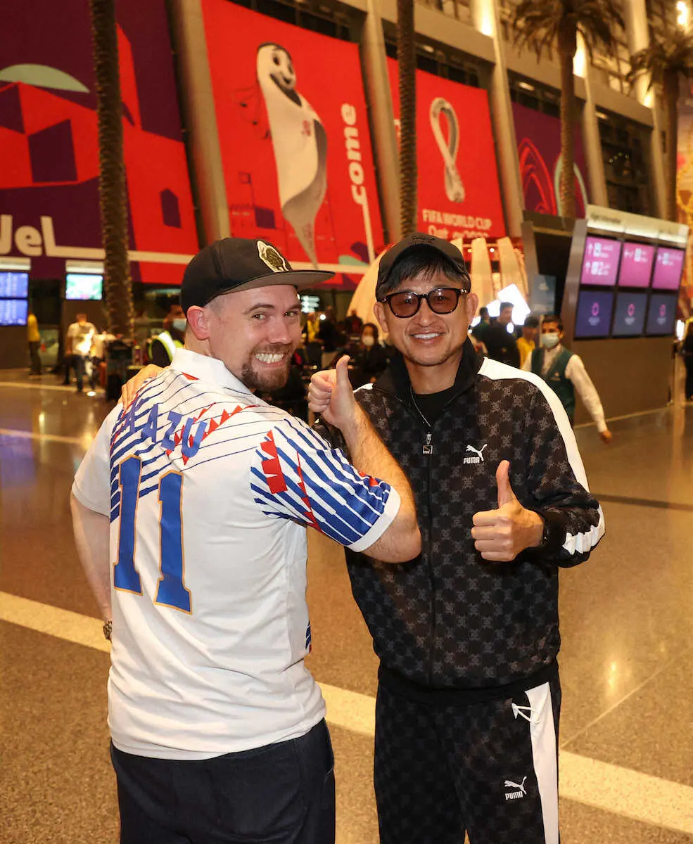 ハマド国際空港は14年開港で「記憶にないですね」と苦笑い。「でも現地の方が白い服を着ているのを見るとね、来たなという感じ」と話し、当時の代表ユニホームを着たファンとの写真撮影に笑顔で応じた。日本―ドイツを含む2試合を観戦予定で「先のことよりもドイツ戦に期待したい」とスタンドから魂を送り届ける。