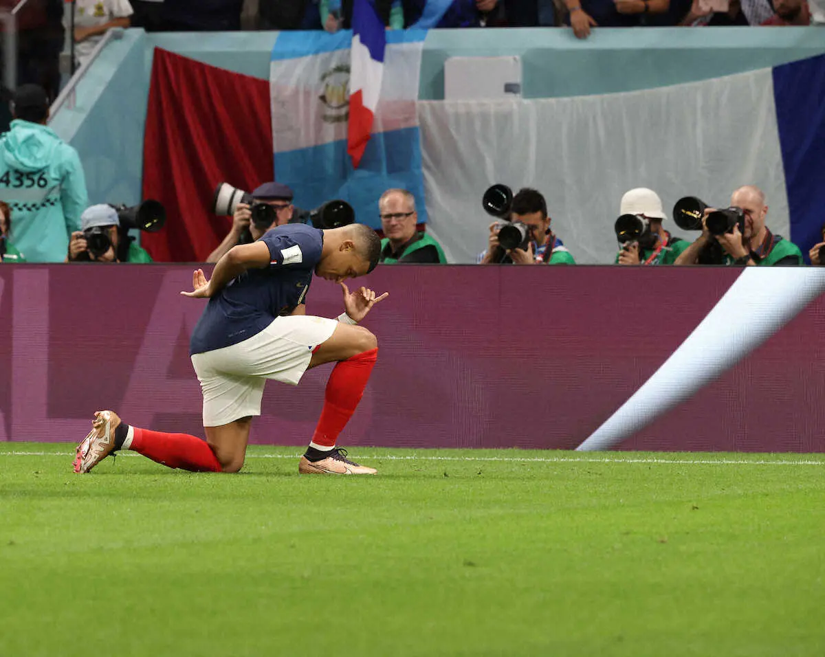 <フランス・オーストラリア>後半23分、ゴールのエムバペはポーズを決める(撮影・小海途 良幹)