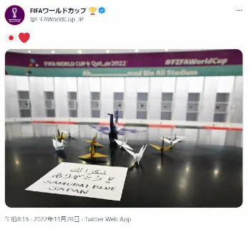 ドイツ戦後には、FIFA公式ツイッターが「ドイツに歴史的な勝利を収めた後、日本のサポーターはスタジアムのゴミを片付け、@jfa_samuraiblueは、このようにハリファ国際スタジアムの更衣室を後にしました。ピカピカ。Domo Arigato」と紹介。きれいに畳まれたビブスなどがまとめられ、整頓されたロッカーの画像をアップした。さらに、ロッカーには感謝を示す折り鶴が置かれ、日本語とアラビア語で書かれた「ありがとう JAPAN」のメッセージもあった。