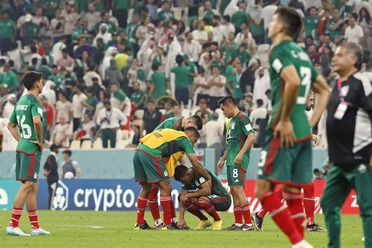 <サウジアラビア・メキシコ>サウジアラビアに勝利したが、得失点差で1次リーグ敗退が決まり、肩を落とすメキシコイレブン=ルサイル(共同)