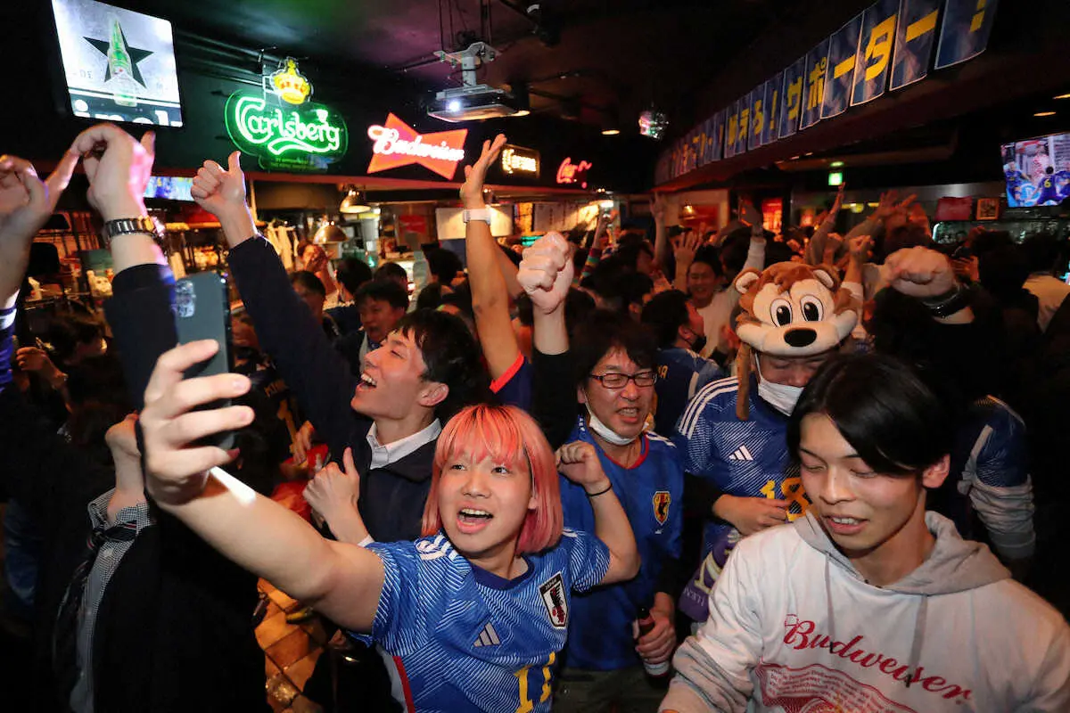 <サッカーW杯、日本代表戦雑感>前半、前田の先制ゴールに盛り上がるスポーツバーのサポーターたち(撮影・村上 大輔)