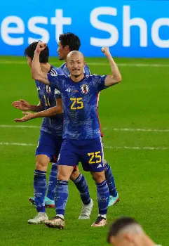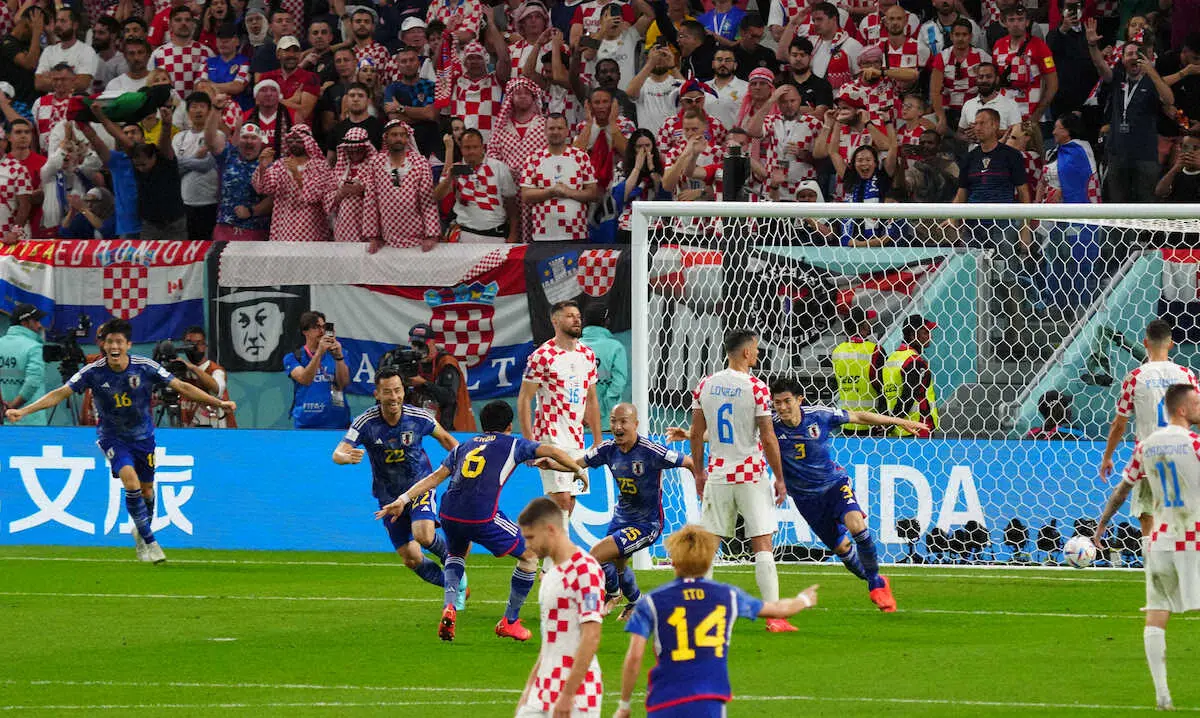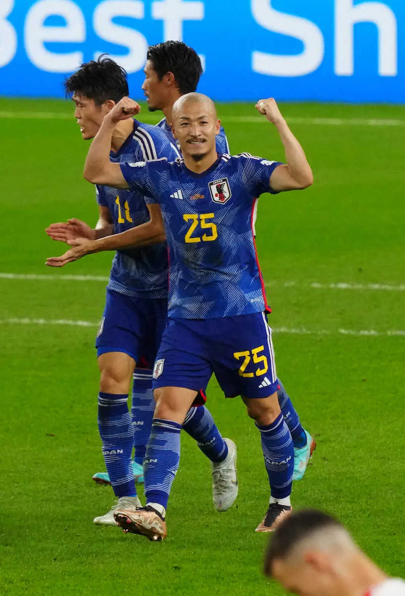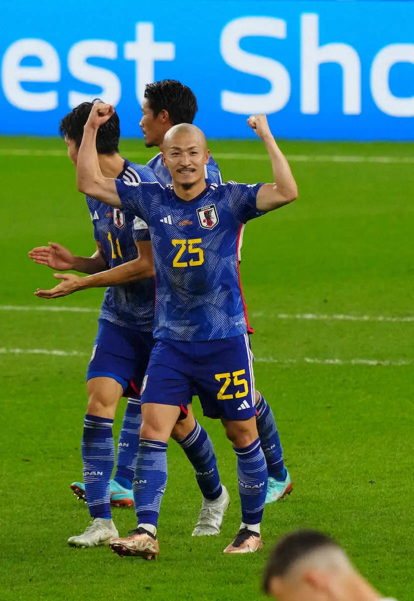 <日本・クロアチア>前半、先制ゴールを決め喜ぶ前田(右から2人目)に谷口、吉田、冨安も笑顔(撮影・西海 健太郎)