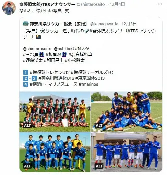 J1王者横浜のユースチームに所属していたという斎藤アナは、高校生だった13年に、当時川崎FのU―18チーム所属の三笘、板倉と神奈川県選抜のメンバーとして東京国体に出場した。その時の集合写真が神奈川県サッカー協会広報ツイッターに掲載され「なんと、懐かしい写真…笑」と引用ツイートで懐古。さらに、その後の投稿では「日本、再び見せてやりましょう!!今日は仕事のため会社で観戦します!日本全体でカタールにエールを送りましょう」と応援メッセージを記した。