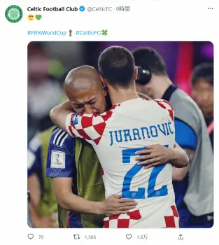 試合終了後、悔し泣きする前田とユラノビッチが抱き合ってお互いの健闘を称え合っている画像がアップされた。普段はチームメートだが、国の代表として対決。試合が終わればまた戦友に戻って称え合う姿に、フォロワーからは「泣いている…前田がCelticFCで頑張ってくれることを願っています。クロアチアおめでとう」「ありがとう We are family」「すごくいい写真」「元気出して」「これは泣けるな」「この写真は何回見ても感動する、試合では敵同士だった2人はまたセルティックで同士となる」「勝ち負け関係なく、お互いにに称え合うて素晴らしい」などとコメントが寄せられた。