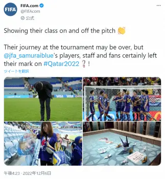 深々と一礼する森保一監督を始め、代表イレブンのプレー、ごみ拾いするサポーター、整頓されたロッカーの画像を公開。「ピッチの中でも外でも気品あるプレーを見せた大会での彼らの旅は終わったかもしれない。しかしJFA_SAMURAIBLUEの選手、スタッフ、ファンは確実に#Qatar2022に足跡を残した」と称えた。試合後、ごみを集める日本サポーターの動画も投稿し「勝っても負けても、試合後のスタジアムの掃除を手伝ってくれた ファンの皆さんありがとう」と感謝。またインスタグラムでも同じ画像を投稿し、「胸が張り裂ける思い」とメッセージが添えられた。