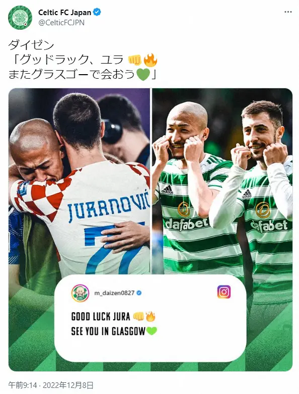 前田大然公式インスタグラム(@m_daizen0827)から 日本代表・前田大然 クロアチア戦で対決したセルティック同僚に「頑張っ… ギャラリーで見る この記事のフォト 2022年12月08日の画像一覧 もっと見る 2022年12月08日の画像をもっと見る
