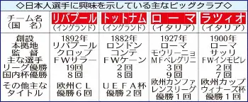 ビッグクラブから熱視線を送られているのは、守田だけではない。ドイツ紙ビルトは8日、Eフランクフルトとの契約が今季限りで満了する鎌田の移籍先に、ドルトムントのほか、イングランド・プレミアリーグの名門トットナムが再浮上したと報道。さらに最強ジョーカーとして、ドイツとスペイン撃破の立役者となったブライトンのMF三笘にはプレミアの名門リバプール、同じくドイツ、スペイン戦で同点弾を決めたフライブルクのMF堂安にはローマ移籍の可能性が報じられている。