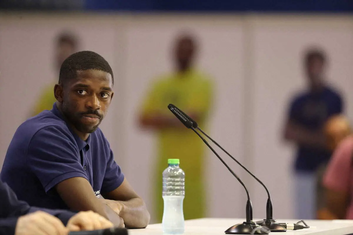 会見に臨むフランス・デンベレ(撮影・小海途 良幹)
