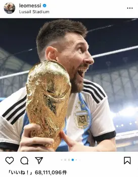 メッシとW杯トロフィー“2ショット” インスタ最多6800万超「いいね!」