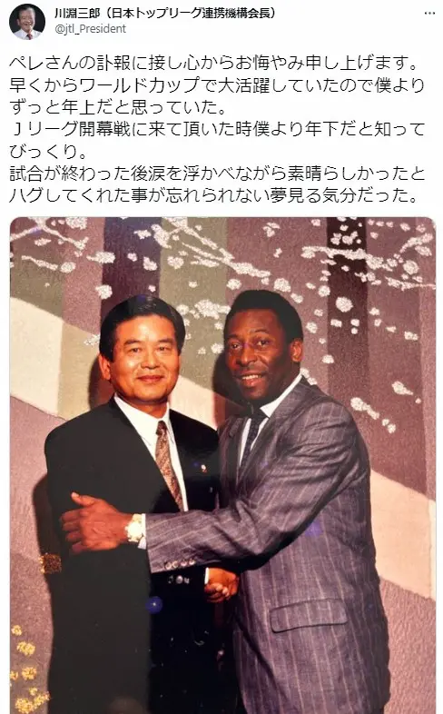 元日本サッカー協会会長で、Jリーグ初代チェアマンも務めた川淵三郎氏(86=日本トップリーグ連携機構会長)も、自身のツイッターで追悼。「ペレさんの訃報に接し心からお悔やみ申し上げます。早くからワールドカップで大活躍していたので僕よりずっと年上だと思っていた。Jリーグ開幕戦に来て頂いた時僕より年下だと知ってびっくり。試合が終わった後涙を浮かべながら素晴らしかったとハグしてくれた事が忘れられない夢見る気分だった」と、2ショットを添えて故人を偲んだ。