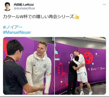 内田氏は「カタールW杯での嬉(うれ)しい再会シリーズ」とつづると、ドイツ代表主将のGKマヌエル・ノイアー(36)と対話し、抱き合うショットを披露した。
