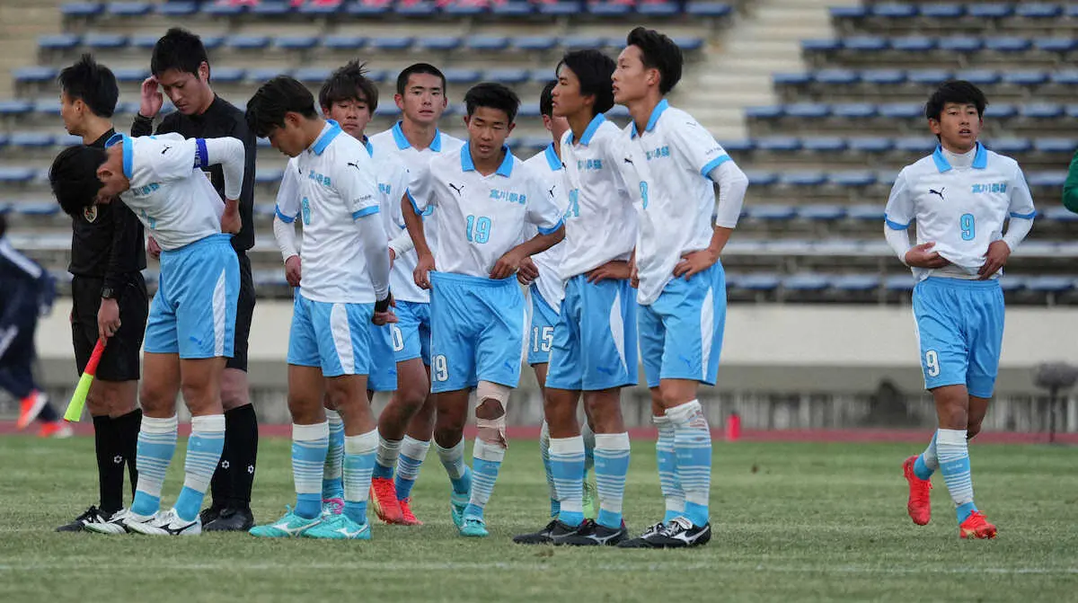 高川学園(山口)は4強入りした前回大会では、手をつないで円をつくり回転して相手を翻弄(ほんろう)する「トルメンタ」などセットプレーが世界中のSNSで話題になった。しかし、この試合では不発に終わりFW山本吟侍(2年)は「あいまいな形になってしまった」と悔やんだ。開始1分で先制点を奪われ、江本孝監督は「出はなをくじかれた」とがっかり。下級生が多いチーム。山本は「もっと信頼される選手になって来年は日本一を」と巻き返しを誓った。