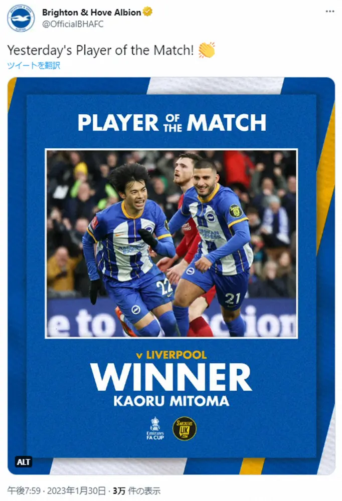 ブライトンの日本代表MF三笘薫(25)が29日、リバプールとのFA杯4回戦に先発出場し、芸術的な決勝ゴールで2―1の勝利に貢献。クラブ公式サイトのマン・オブ・ザ・マッチ(MOM)投票では得票率73.7%%で断トツの1位に輝き、ネット上からも喜びの声が上がった。