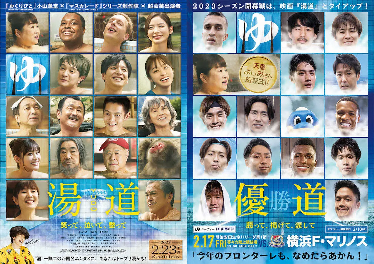 異例のタッグが、Jリーグの開幕を盛り上げる。川崎Fは横浜との開幕戦で、映画「湯道」(監督鈴木雅之、23日公開)とコラボイベントを実施。映画に出演する歌手の天童よしみ(68)が始球式に登場し、選手入場の際には即席の番台に乗って「番台さん」として選手を送り出す。