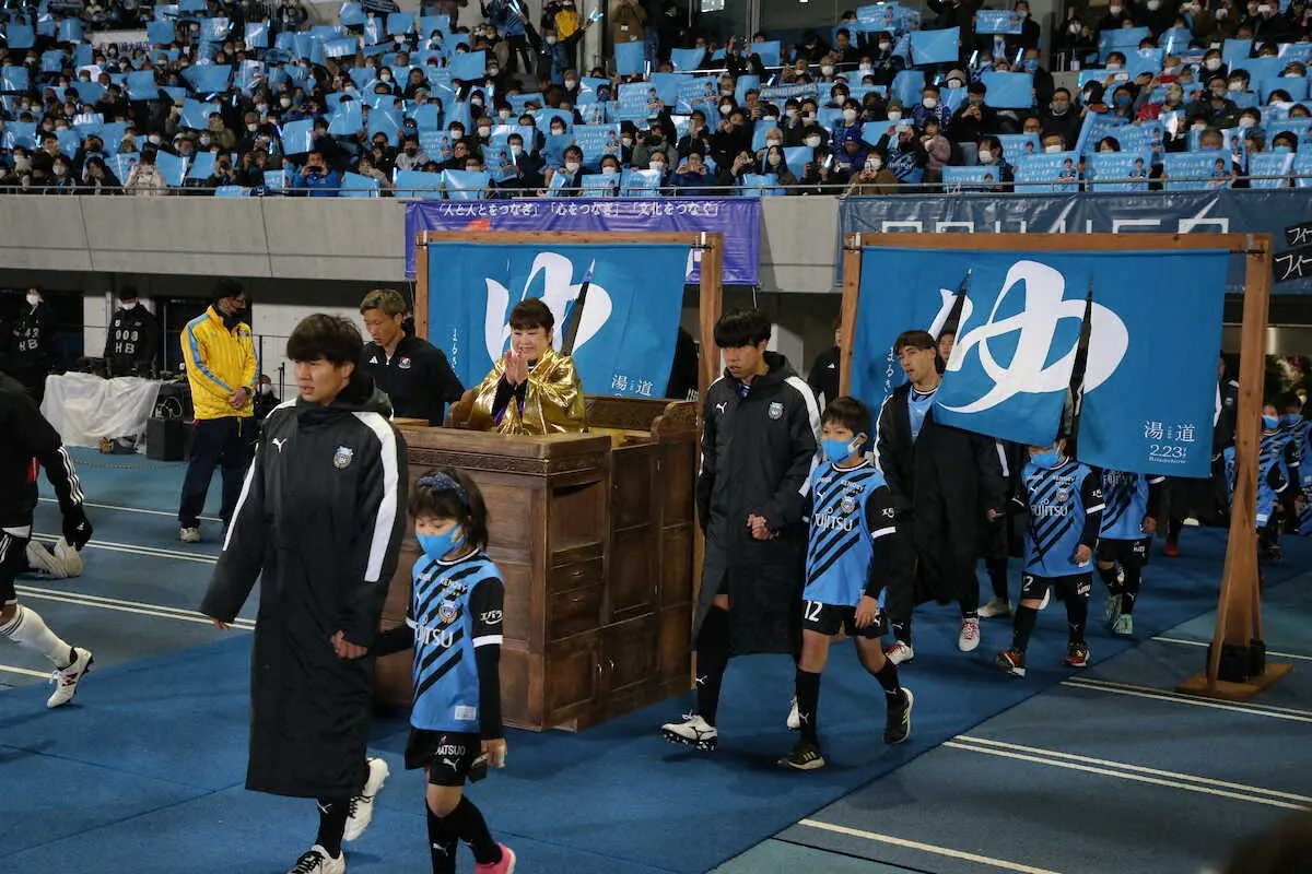 ホームの川崎Fが、映画「湯道」(監督鈴木雅之、23日公開)とコラボイベントを実施。映画に出演する歌手の天童よしみ(68)がキックオフ前の始球式に登場し、「お風呂の映画だけに、熱い思いで応援していただきたい。絶対になめたらあかん~!なめたらあかん~」と最後は熱唱しながら、全席で声出し応援可能となった会場に声援を呼びかけた。
