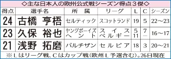 セルティックのFW古橋亨梧(28)が26日、スコットランド・リーグ杯決勝のレンジャーズ戦で2得点を挙げて2―1の勝利に貢献し、チームを2季連続21度目の優勝に導いた。昨季の同杯決勝に続く2得点で、今季公式戦24得点。16~17年久保裕也(ヤングボーイズからシーズン中にヘント移籍)の23得点を上回って日本人欧州公式戦最多ゴールとなった。