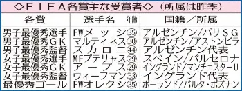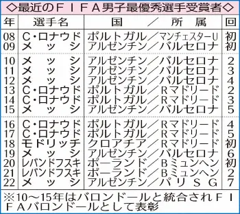W杯の開催時期が通例とは異なったことで、表彰の対象期間も21年8月から22年12月のW杯までと変則的だった。パリSGに移籍した21~22年は本領を発揮できず、同シーズンを対象とした世界最優秀選手賞「バロンドール」は候補の30人からも外れていたが、「最後のW杯」と公言した大舞台では7ゴール。強烈なインパクトを残し、世界中の代表監督、主将、メディア、ファンの投票で圧倒的な支持を受けて“世界一”に返り咲いた。