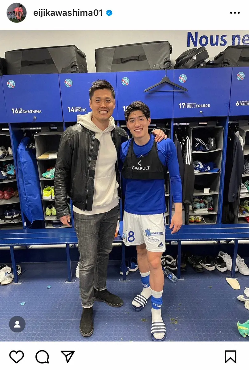 W杯4大会連続代表のGK川島永嗣(40=ストラスブール)が17日、自身のインスタグラムを更新。チームの後輩であるMF鈴木唯人(21)の初得点を祝福した。