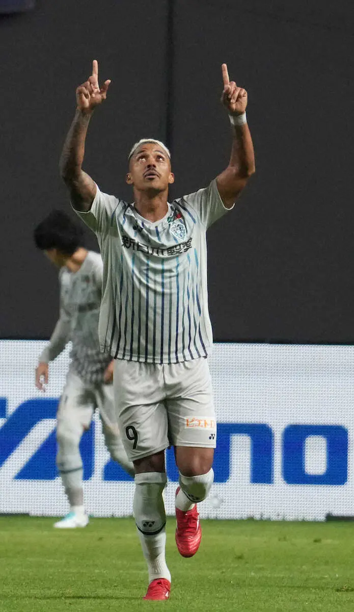 <札幌・福岡>後半、同点となるPKゴールを決めポーズする福岡・ルキアン(撮影・高橋 茂夫)