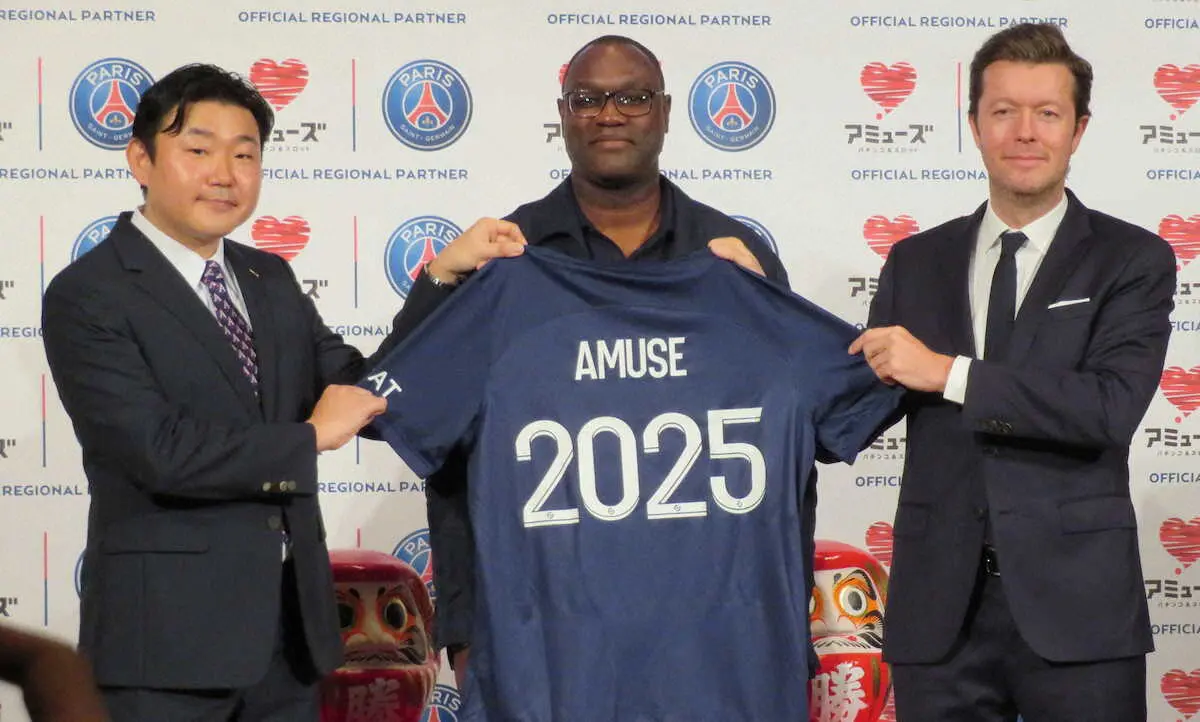 サッカーのフランス1部パリ・サンジェルマンとパチンコなどアミューズメント事業経営を行っているアミューズ(本社・大阪)の公式リージョナルパートナー契約締結会見が27日に都内で行われ、クラブOBで、G大阪でJ1得点王に輝いた元カメルーン代表FWパトリック・エムボマ氏(52)らが出席した。