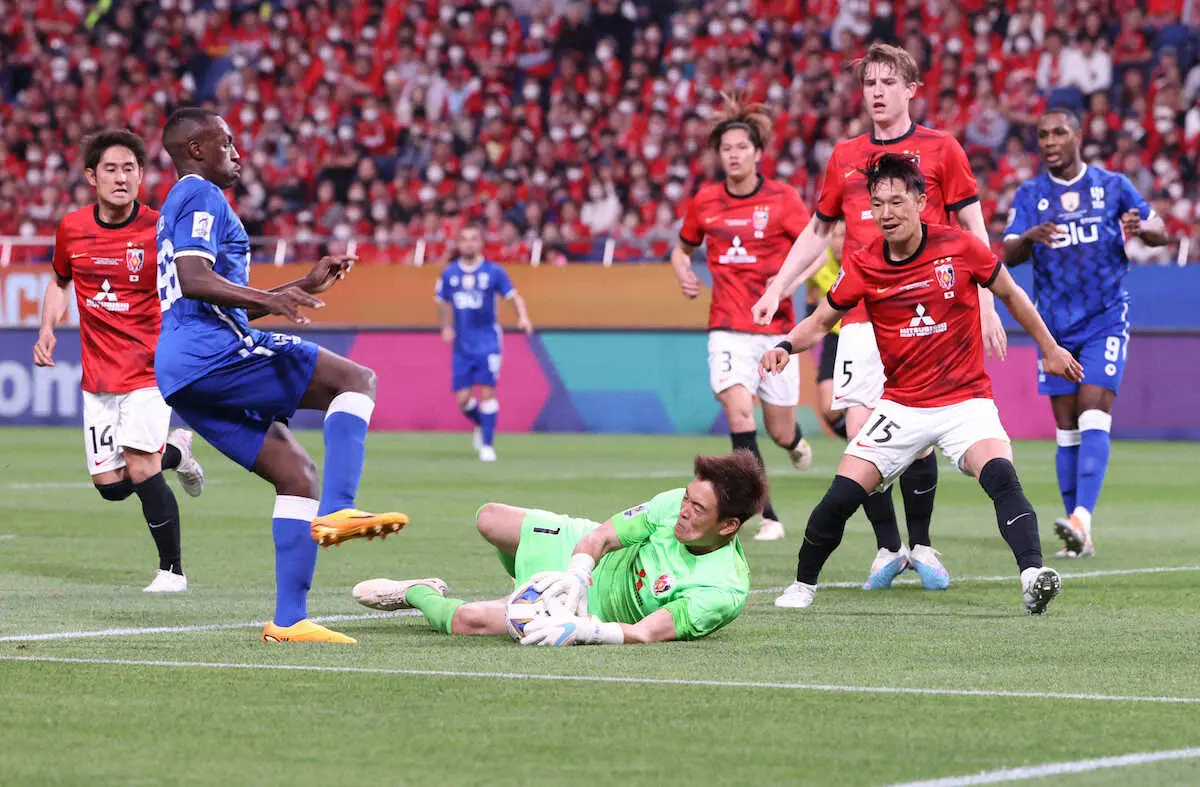 <浦和・アルヒラル>後半、ゴールを死守する西川(中央)(撮影・小海途 良幹)