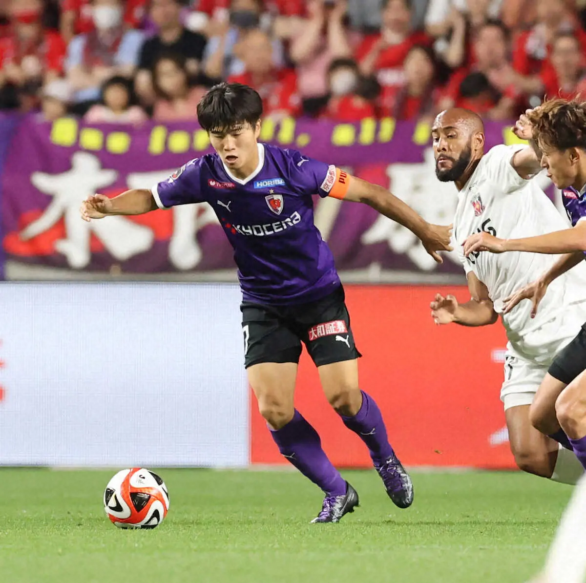 <京都・浦和>後半、攻め込む京都・川崎颯太(左)(撮影・岸 良祐)