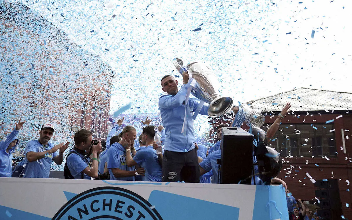 サッカーの欧州CL初優勝でプレミアリーグ、FA杯を合わせた3冠を達成したマンチェスターCが12日に地元・英マンチェスターで凱旋パレードを行った。