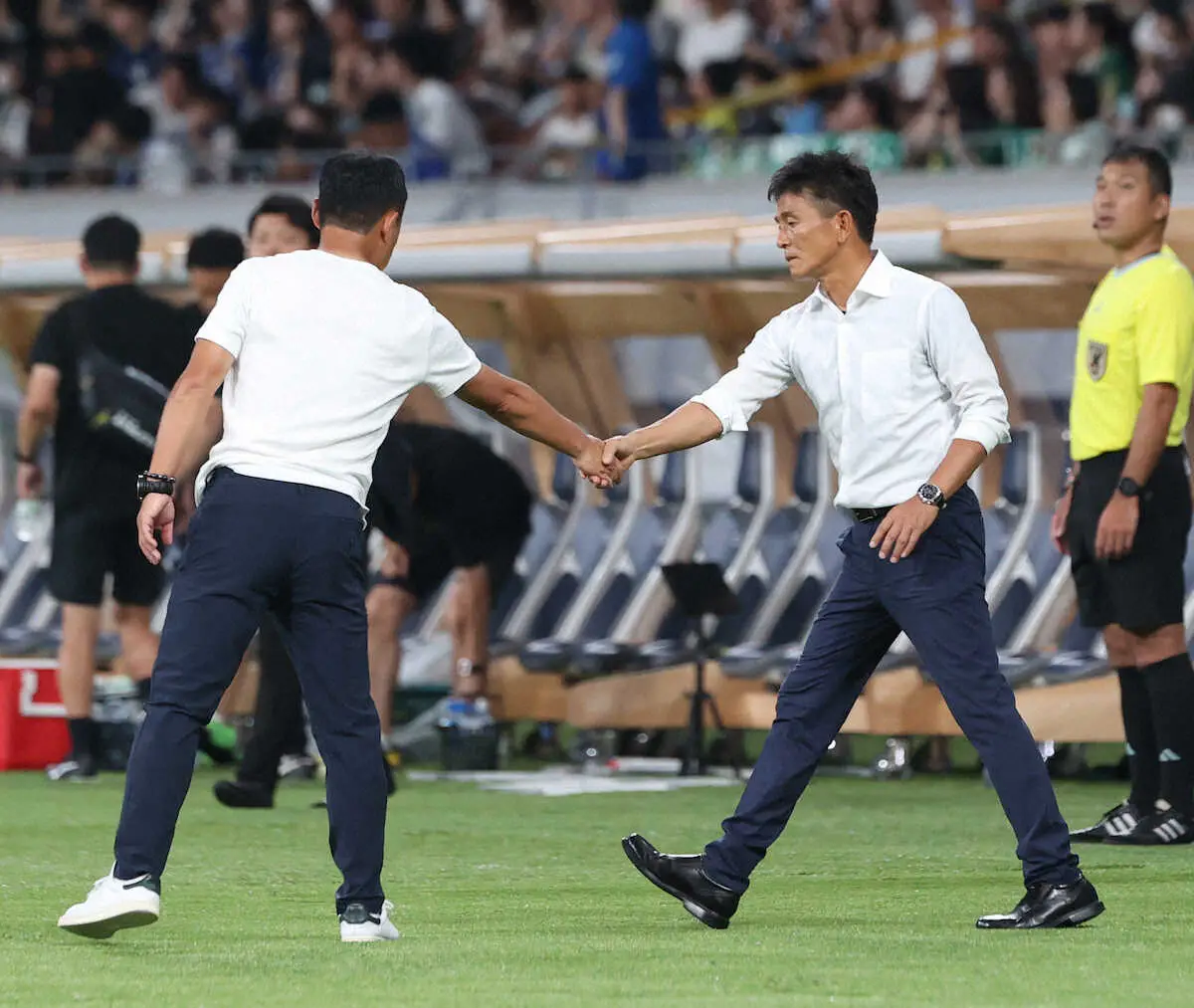 <町田・東京V>派手な演出の中、サポーターにあいさつした東京Vイレブン(撮影・西海健太郎) Photo by スポニチ 町田と東京VのJ2国立上位決戦は2―2でドロー決着 主力バスケスの移籍余波… ギャラリーで見る この記事のフォト 2023年07月09日の画像一覧 もっと見る 2023年07月09日の画像をもっと見る