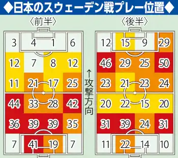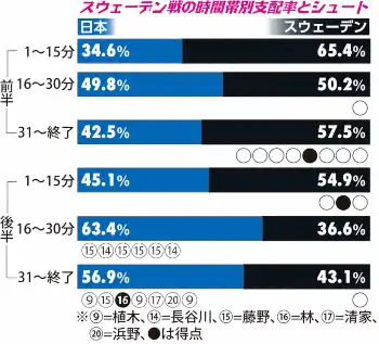 スウェーデンはフィジカルに加え、技術、スピードもレベルが高く、開始から苦しい展開が続いた。日本はスペイン戦同様、強固な守備からカウンターを狙ったが、前線から激しいプレッシャーをかけられた上にパスコースもふさがれ、判断が遅れるとすぐさまボールを奪われた。DFを統率した熊谷の前半平均プレーライン(相手ゴールラインからの距離)は今大会で最も低い79・3メートル。自陣深くまで引き込んで守る形が、前半32分のFKからの失点となった。