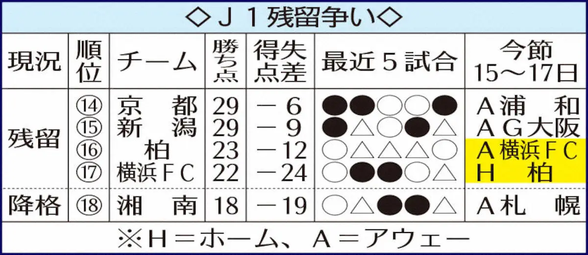 16位柏と17位横浜FCは勝ち点1差。J1残留へ、ライバルは叩くのがベストだ。8月以降はリーグ戦5試合と天皇杯2試合負けなしと好調。「負けることを心配するより、自分たちが勝つことに集中できている。今の流れを生かしていかないと」と勝利へのこだわりを口にした。