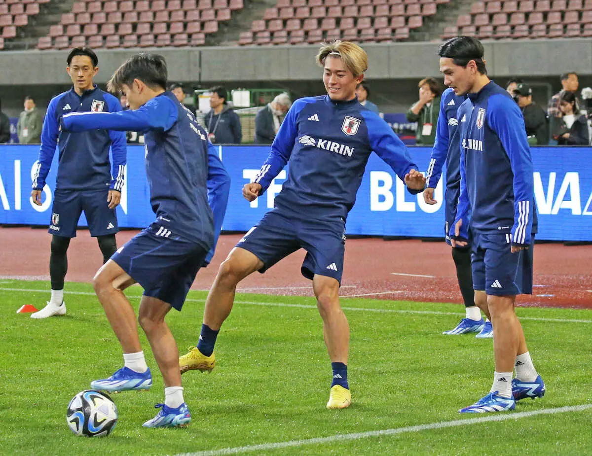 サッカー日本代表はきょう13日、新潟・デンカビッグスワンスタジアムでカナダ代表と親善試合を行う。体調不良で参加辞退したMF三笘薫(26=ブライトン)が任されていた左サイドには、代表デビューから3戦3発と好調のMF中村敬斗(23=Sランス)のスタメン起用が濃厚。カナダ戦で得点を決めれば史上5人目の偉業を達成となる。三笘に負けじと左サイドで存在感を見せつける。