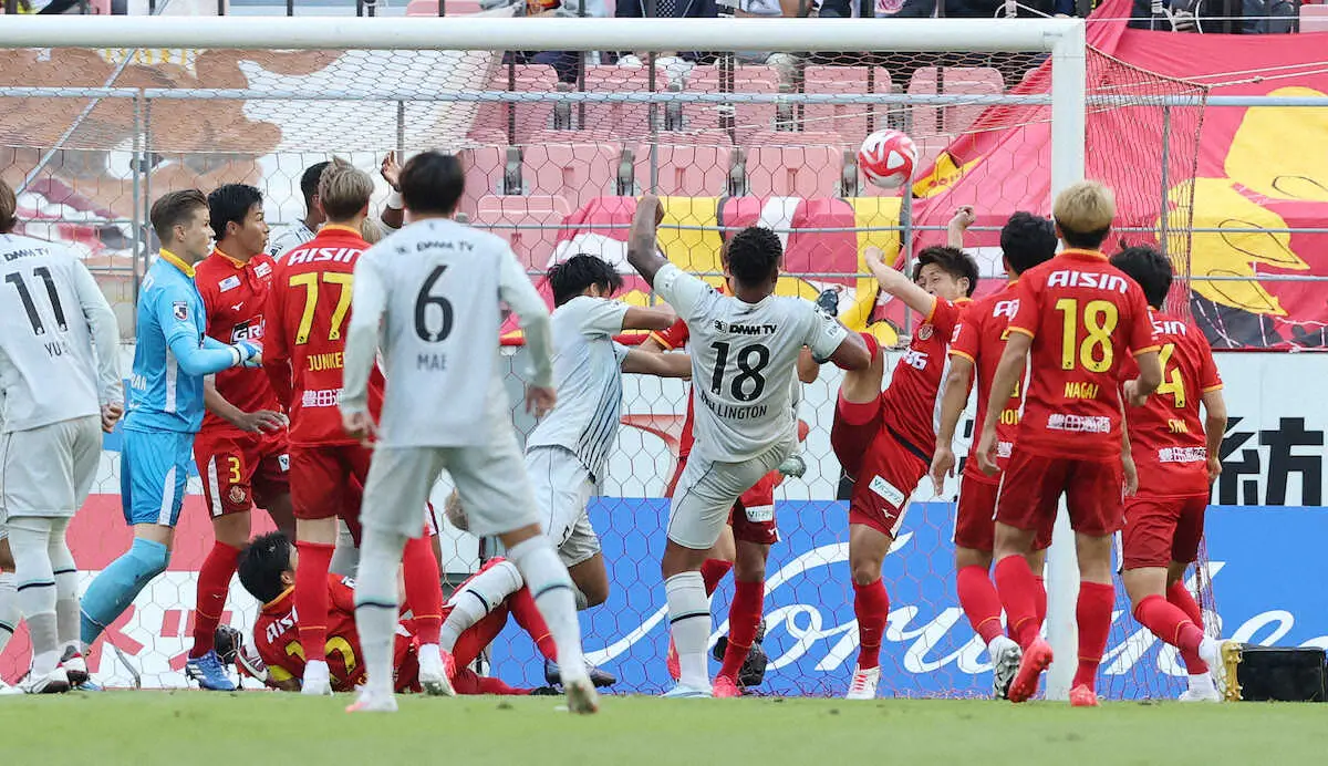 <ルヴァン杯準決勝 名古屋・福岡>前半5分、ウェリントン(背番18)はゴール前の混戦から蹴り込み、先制ゴールを決める(撮影・椎名 航)