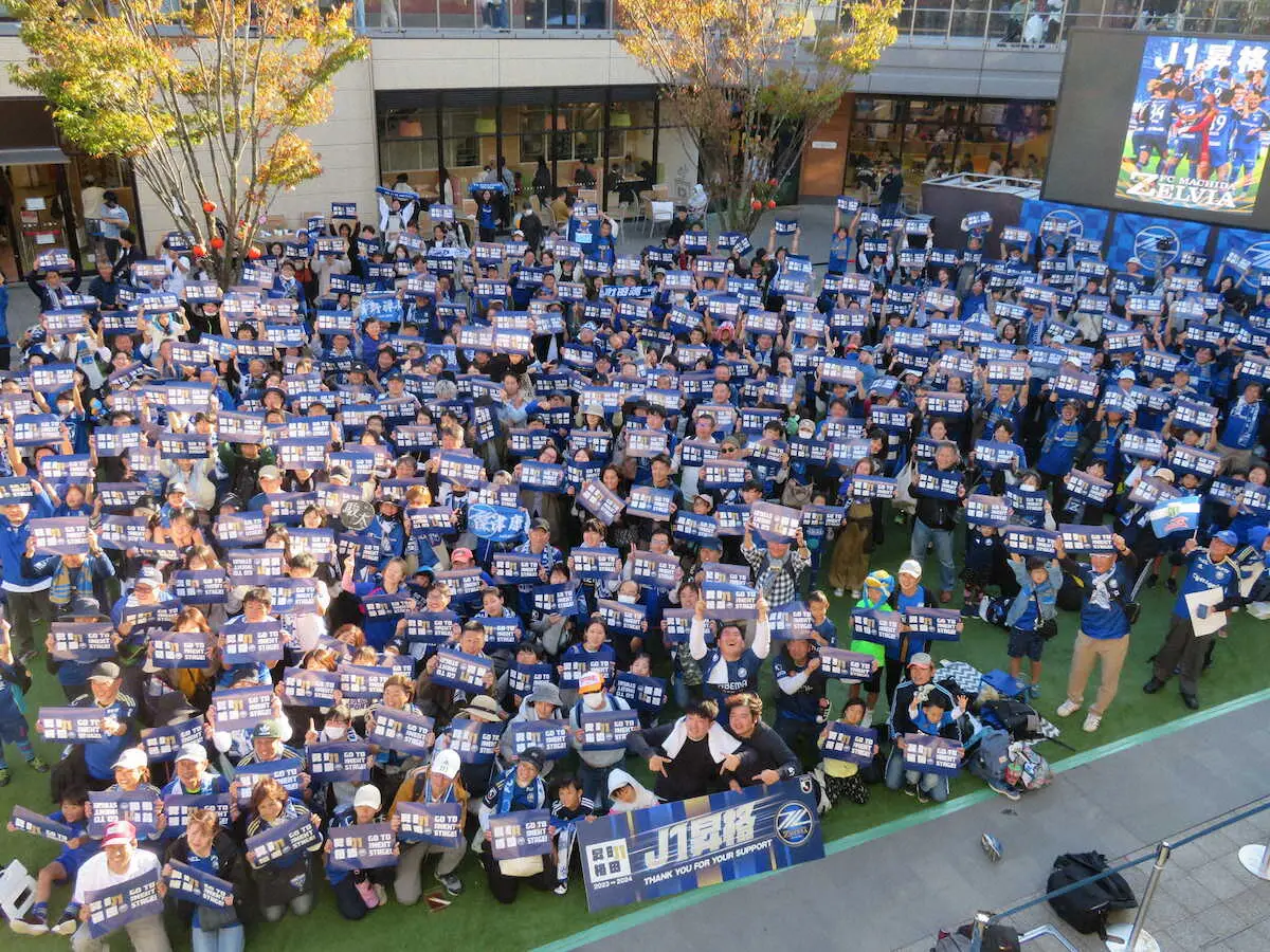 サッカーJ2町田のJ1昇格を見届けようと22日、南町田グランベリーパークでパブリックビューイング(PV)が行われた。会場にはユニフォーム姿の約1000人が集まり、アウェーで戦う町田イレブンに声援を送った。