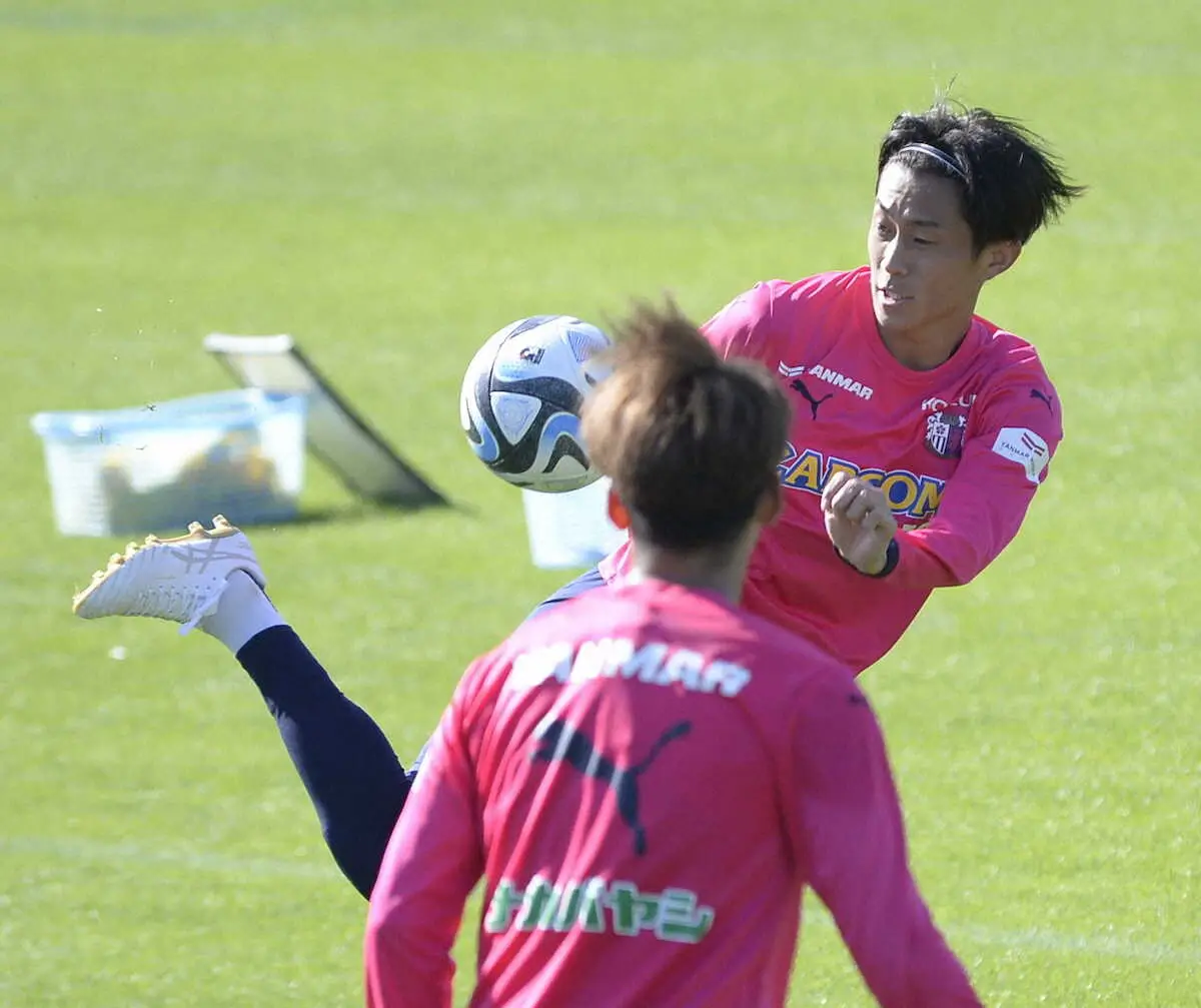 後ろ足で器用にボールを蹴るC大阪DF毎熊晟矢