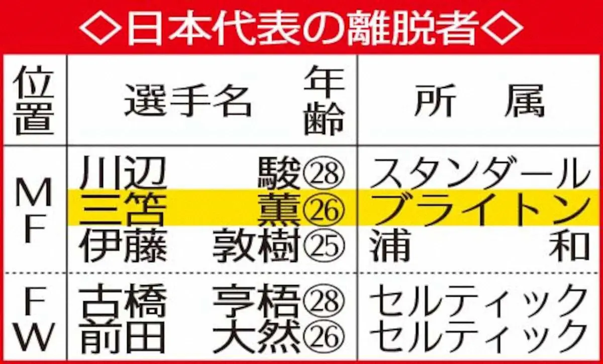 三笘は体調不良で辞退した10月に続いての不参加。協会を通じ「W杯予選ということもあり、チームの力になれると信じて合流しましたが、残念ながら100%の状態でプレーできないということもあり、悔しいですが、残ったチームメートに思いを託したいと思います」とコメントした。今回の負傷による不参加は5人目。
