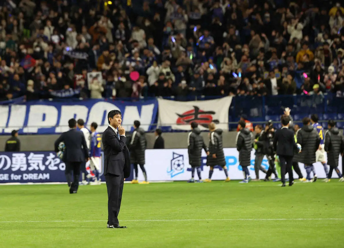 <日本・ミャンマー>試合後、場内一周するイレブンを背に思案顔の森保監督(撮影・西海健太郎)