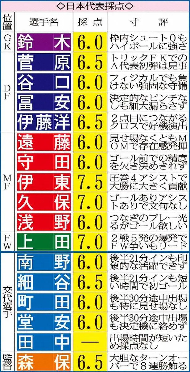 <シリア・日本>勝利し、サポーターにあいさつした日本イレブン(撮影・西海健太郎) Photo by スポニチ 森保ジャパン「慎重から大胆」に変わった2023年 48人招集で26年W杯へ戦力… ギャラリーで見る この記事のフォト 2023年11月23日の画像一覧 もっと見る 2023年11月23日の画像をもっと見る