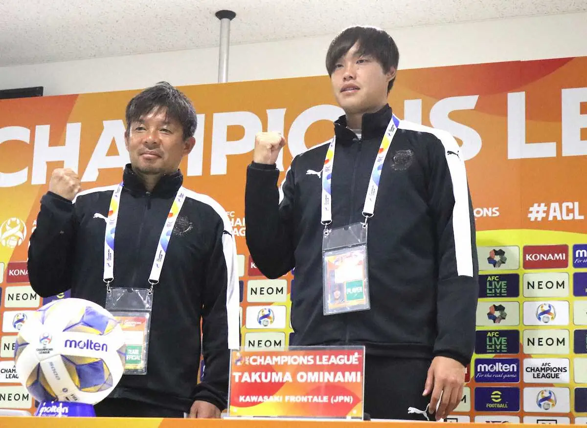 ACL第5戦のジョホールDT戦前日会見で意気込む川崎F鬼木監督(左)とDF大南