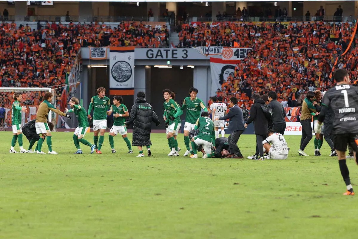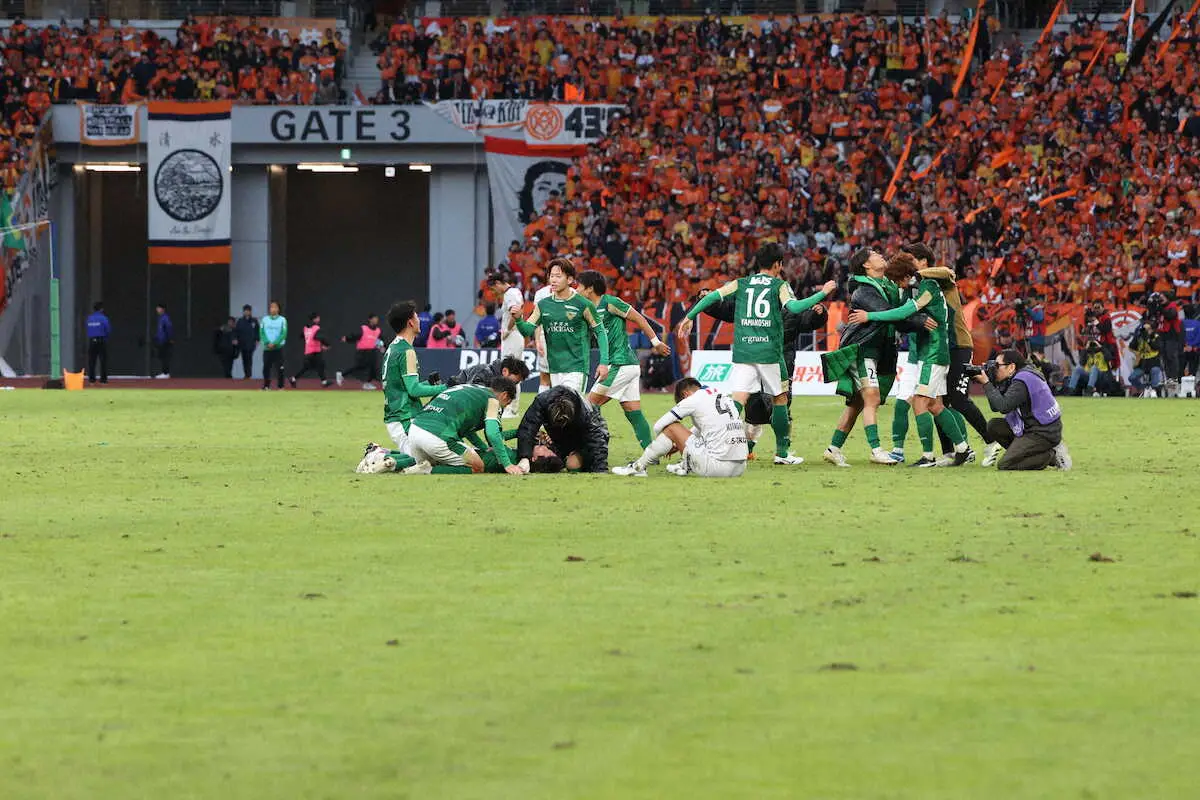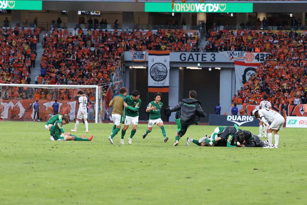 <東京V・清水>16年分の歓喜!涙を流し、抱き合い喜び合う東京Vイレブン(撮影・西海健太郎)