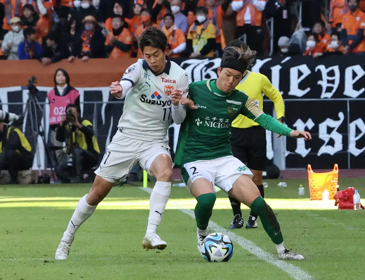 <東京V・清水>前半、競り合う清水・中山と東京V・深沢(右)(撮影・西海健太郎)