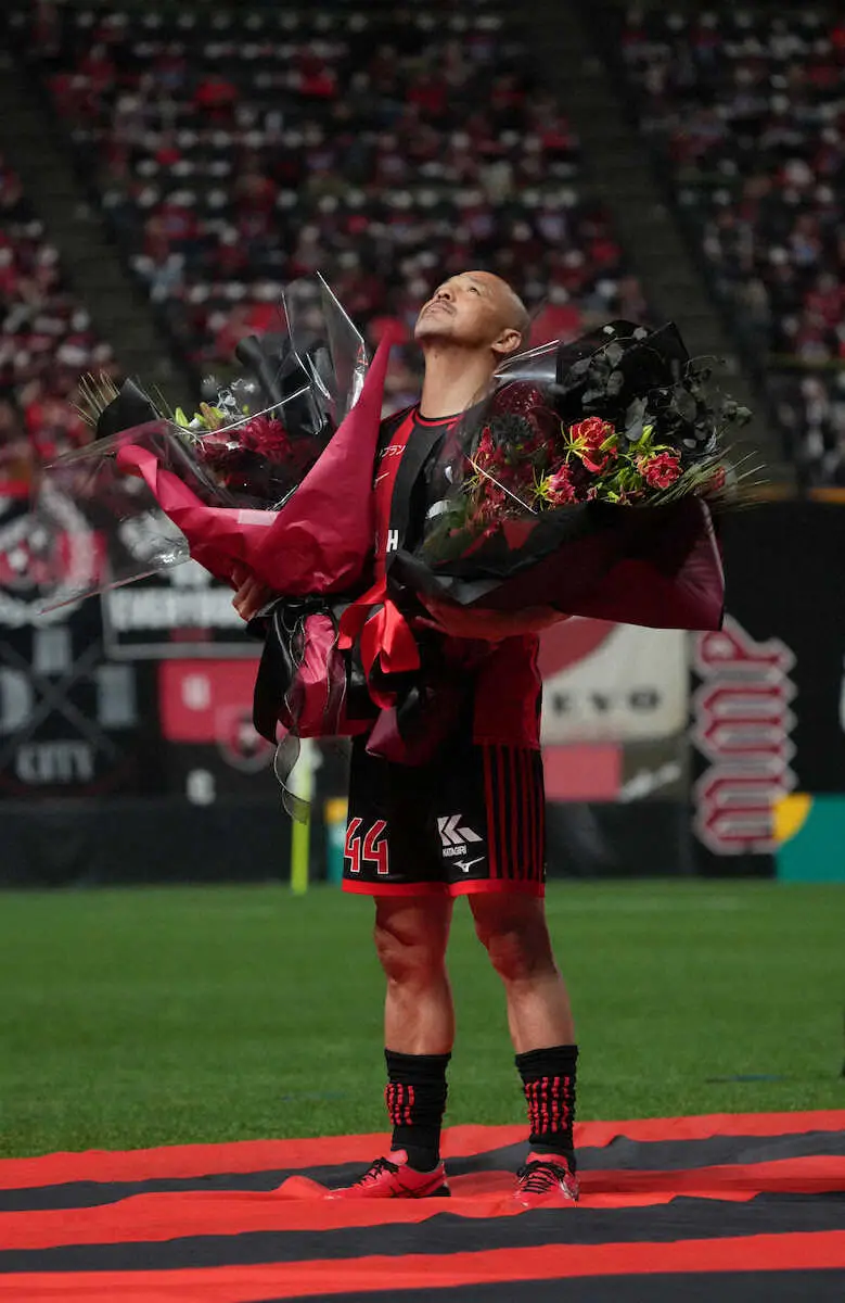 この日のプレーを振り返り「短い時間でしたけども自分の持っている力を出せたんじゃないかと思います」とコメント。「今日でプロサッカー選手生活が終わりますけど、僕自身はこれからも変わらずサッカーを愛し楽しんでサッカーを続けていくので、これからもどうかよろしくお願いします」と話した。さらには「今日、この会場に足を運んでくれた仲間たち。皆さんが力を合わせればこういう景色を作る事が出来るんです。どうぞ来シーズンもこういう景色を残された選手たちに作ってあげてください」と3万超えとなったサポーターたちへお願いした。